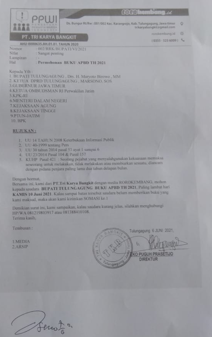 Maka dari itu direktur rorokembang E. Puguh P. berkirim surat kepada Bupati Tulungagung sebagai kepala pemerintahan Kabupaten Tulungagung meminta buku APBD th 2021 agar bisa ikut mengawasi penggunaan dana & jalanya pemerintahan apakah sudah sesuai dengan yang sudah direncanakan dan dianggarkan. surat itu tidak hanya ditujukan ke Bupati tetapi juga apihak terkait seperti Gubernur Jatim, Ketua DPR, Kejaksaan Negeri, Kejaksaan Tinggi, BPK, Ombusman, KPK,MENDAGRI,PTUN JATIM.
