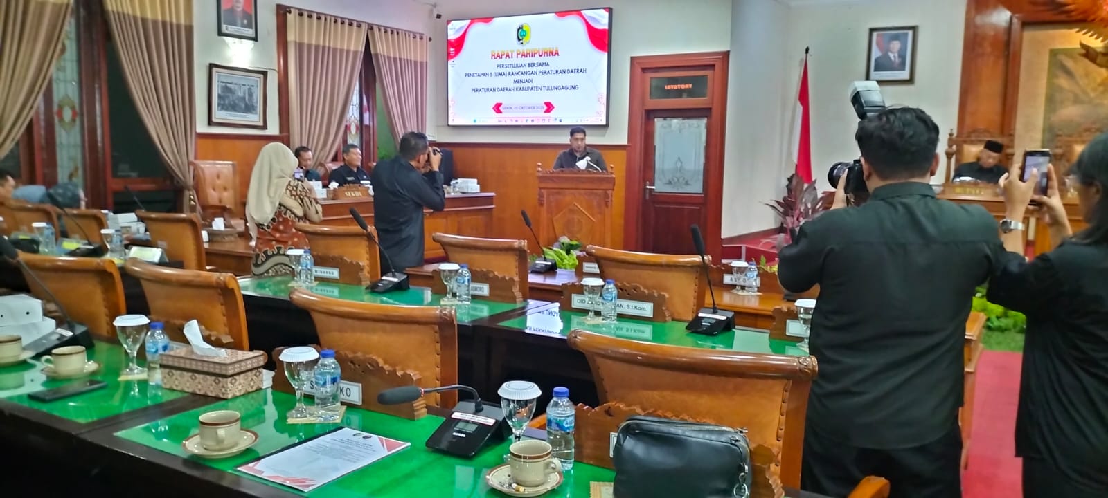 ROROKEMBANG TULUNGAGUNG – Bertempat di Gedung Graha Wicaksana lantai II Kantor DPRD Tulungagung pada Senin (20/10), DPRD Tulungagung menggelar rapat paripurna DPRD dalam rangka penetapan Rancangan Peraturan Daerah (Ranperda) tentang Perubahan Kedua atas Peraturan Daerah Nomor 27 Tahun 2012 tentang Penyelenggaraan Perpustakaan dan Ranperda lainnya.
