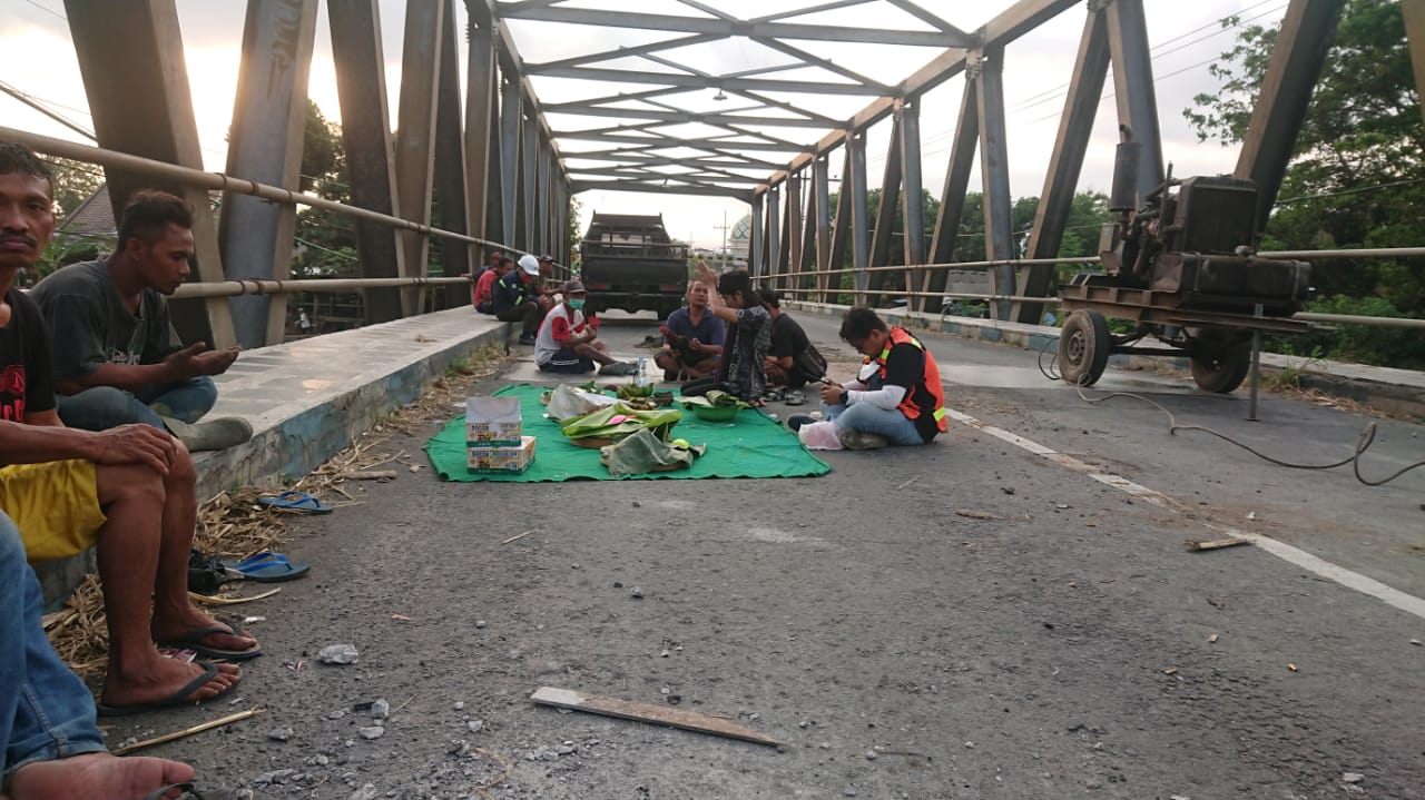 Rorokembang Tulungagung – Sebelum dimulainya pelaksanaan pembangunan jembatan baru oleh kontraktor terlebih dahulu diawali dengan kegiatan selamatan ingkung dan nasi kuning, bubur abang-putih, jadah serta jajan pasar. Selamatan dilakukan di atas jembatan, kontraktor beserta seluruh Pekerja, sebagian warga sekitar lokasi kegiatan dan para pekerja yang siap melaksanakan pekerjaan.