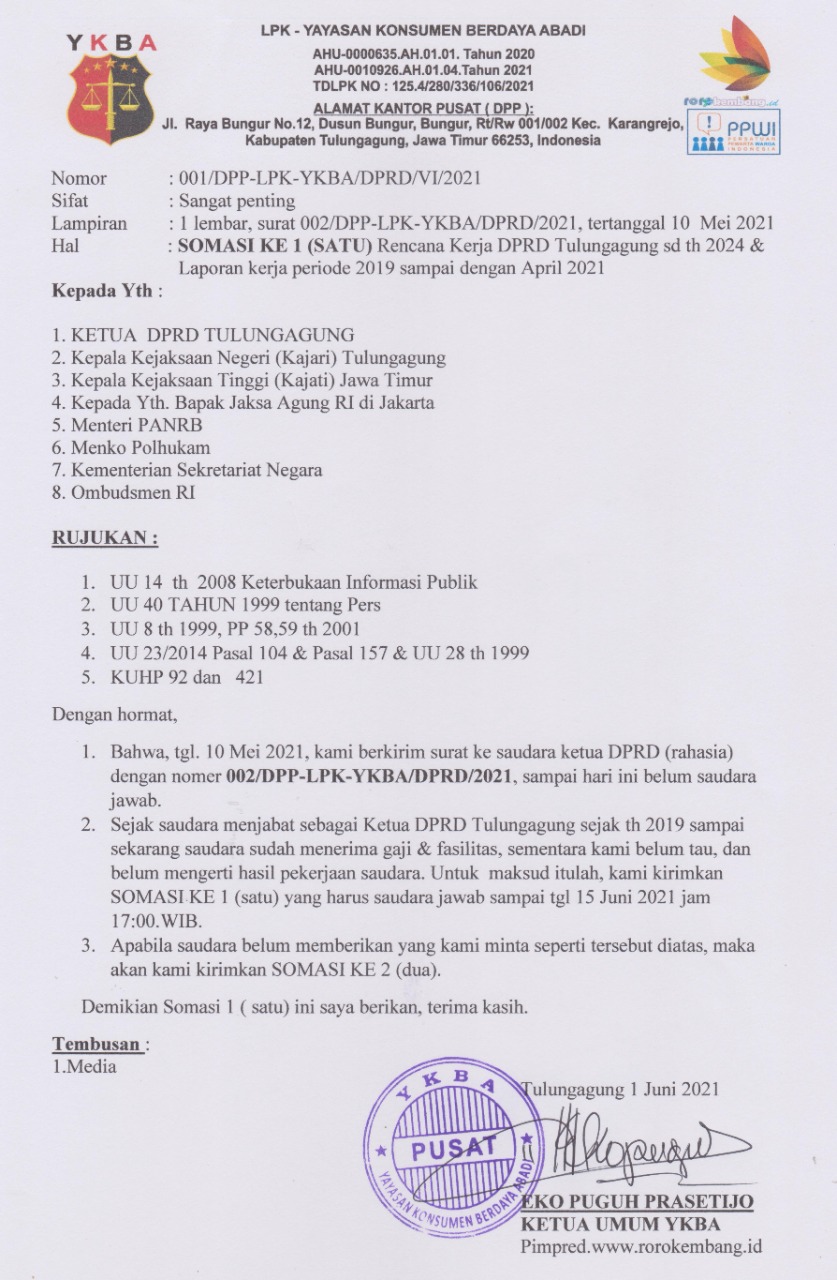 Tulungagung, hari ini Selasa 1 Juni 2021, Pada tanggal 10 Mei 2021,No 002/DPP-LPK-YKBA/DPRD/2021. Ketua Umum LPK-YKBA, Puguh memberikan surat yang sifatnya rahasia kepada Ketua DPRD Tulungagung, Marsono, terkait “Rencana Kerja DPRD Tulungagung sd th 2024 & Laporan kerja periode 2019 sampai dengan April 2021”