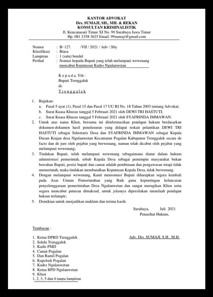 - Bupati Trenggalek MOCHAMAD NUR ARIFIN, telah mengirim Surat Nomor: 140/1541/406.018/2021 tanggal 06 Juli 2021 perihal, TEGURAN kepada Kepala Desa Ngulanwetan Kecamatan Pogalan, perlu kami sarankan menelaah Penjelasan UU Desa bahwa: